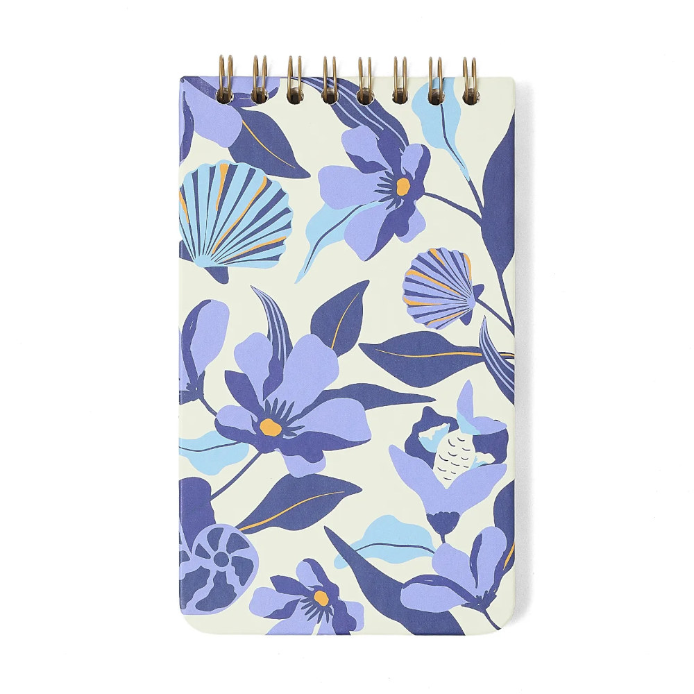 A estampa autoral da Coleção Trancoso 2026, com flores tropicais e conchas em tons de azul sobre fundo off white, transforma um simples bloco em um objeto de desejo. O wire-o dourado e o hot stamping completam o item que une beleza e praticidade com leveza.