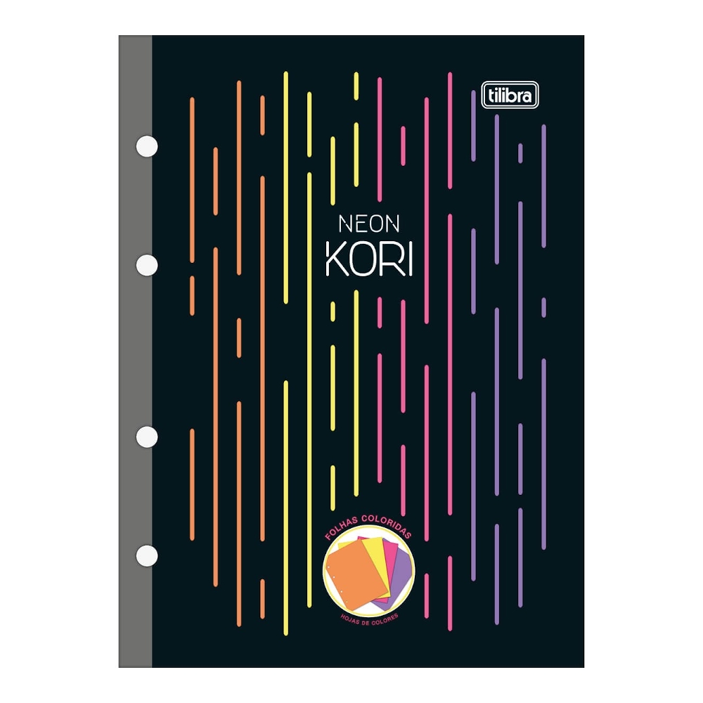 Refil Tiliflex para Caderno Argolado Colegial Neon Kori possui folhas coladas em papel colorido nas cores laranja, amarelo, rosa e roxo. Ideal para o dia a dia na escola ou na faculdade.