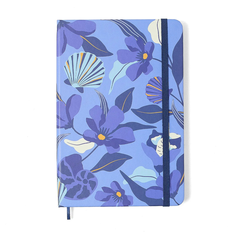 A Coleção Trancoso traz uma capa vibrante e marcante, com flores em tons de azul profundo e lavanda sobre fundo azul, além de detalhes dourados no hot stamping. Uma peça que chama atenção e inspira a criar.