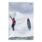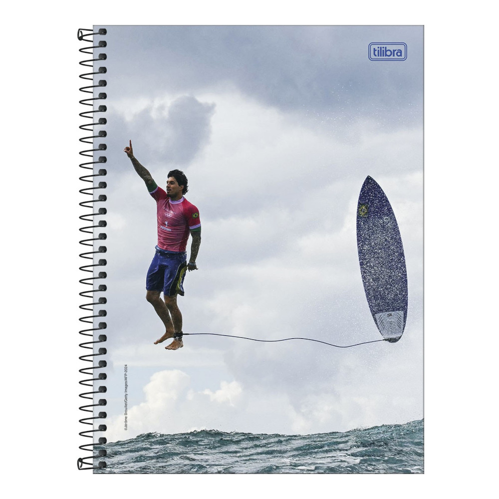 O caderno universitário Gabriel Medina também vem com um pôster autografado da foto que viralizou e se tornou uma das principais imagens das Olimpíadas de Paris, na França.