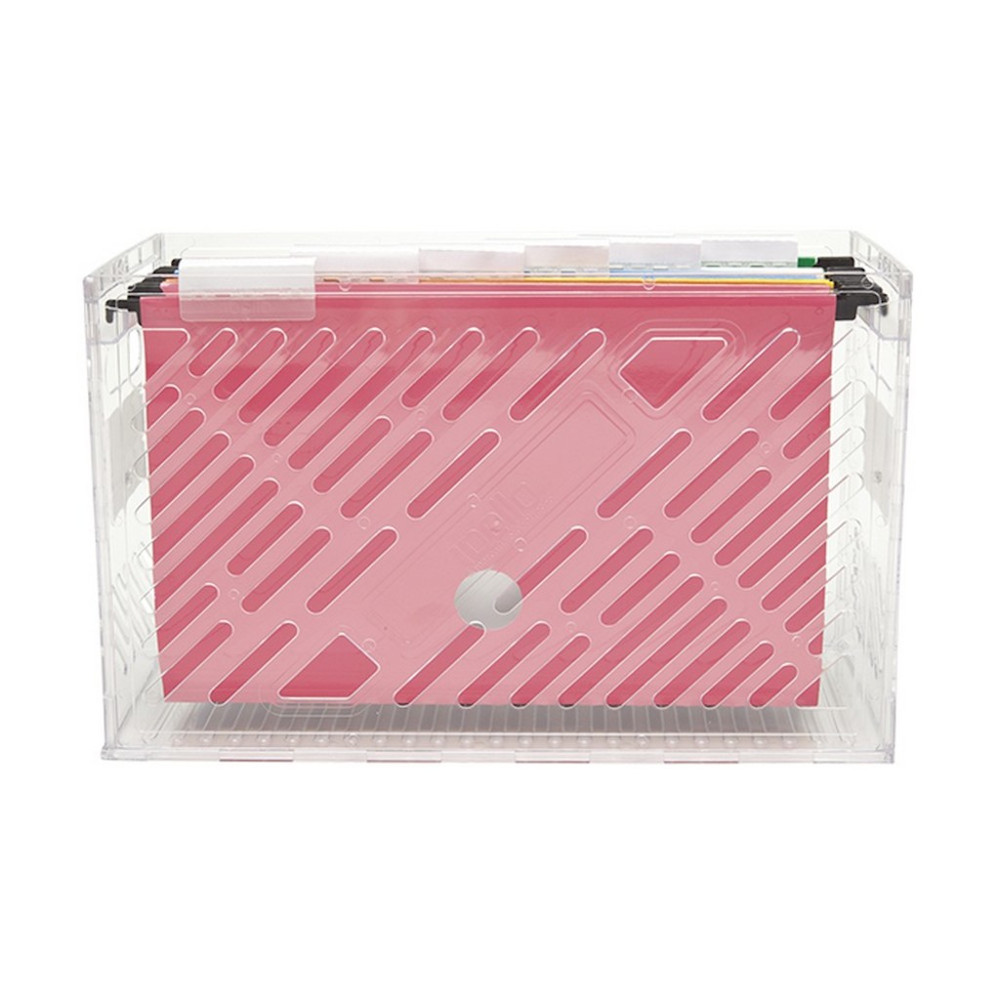 – Caixa para arquivo em poliestireno cristal com 6 pastas suspensas ecológicas.