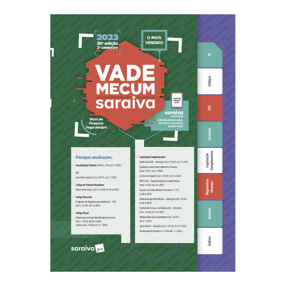 O Vade Mecum Saraiva, livro jurídico mais vendido do Brasil, chega à sua 36ª edição, totalmente revisto e atualizado. Veja a seguir um pouco do que você vai encontrar neste Vade Mecum e entenda a razão de ele ser preferido em meio a tantos outros disponíveis no mercado: – Legislação revista e atualizada a cada edição (ele reúne as normas mais importantes do ordenamento jurídico) tudo selecionado com base na grade curricular das principais faculdades de Direito e em editais de concursos para carreiras jurídicas; – Notas remissivas e índices são várias correlações entre as matérias e índices multifuncionais, que ajudarão você a rapidamente pesquisar por assunto, ordem alfabética, cronológica, pelo número do diploma ou por seu tema; – Dicas de pesquisa (legal design) – tutorial nas páginas iniciais sobre como consultar a legislação e manusear seu Vade Mecum. Além de tudo isso, a partir desta edição, uma NOVIDADE: Saraiva Conecta acesso exclusivo e gratuito à plataforma de conteúdos complementares ao livro, na qual você terá disponível: Legislação adicional diplomas que completam o extenso conteúdo impresso da obra, para você consultar em qualquer lugar; – Materiais complementares para estudo; Serviço Atualize seu Código atualização semanal de todo o conteúdo impresso. Tradição, organização e estrutura, aliadas à confiabilidade da marca Saraiva Jur, explicam por que o Vade Mecum Saraiva é há mais de 15 anos o produto de legislação mais vendido no mercado. Principais Atualizações da 36.ª edição: Constituição Federal (até EC 129, de 5-7-2023) CLT – Igualdade salarial (Lei n. 14.611, de 3-7-2023) Código de Trânsito Brasileiro Exame toxicológico (Lei n. 14.599, de 19-6-2023) Código Florestal Programa de Regularização Ambiental – PRA (Lei n. 14.595, de 5-6-2023) Código Penal Adulteração de sinal identificador de veículo (Lei n. 14.562, de 26-4-2023) Injúria (Lei n. 14.532, de 11-1-2023) – Legislação Complementar Estatuto da OAB alterações (Lei n. 14.612, de 3-7-2023) Igualdade salarial entre mulheres e homens (Lei n. 14.611, de 3-7-2023) Lei Geral do Esporte (Lei n. 14.597, de 14-6-2023) IRPJ e CSLL Regras de preços de transferência (Lei n. 14.596, de 14-6-2023) Imposto de Renda (Medida Provisória n. 1.171, de 30-4-2023) Estatuto da Igualdade Racial alterações (Lei n. 14.553, de 20-4-2023) Estatuto da Criança e do Adolescente alterações (Lei n. 14.548, de 13-4-2023) Número único para documentos (Lei n. 14.534, de 11-1-2023) Injúria Racial alterações (Lei n. 14.532, de 11-1-2023) Desarmamento (Decreto n. 11.366, de 1.º-1-2023)